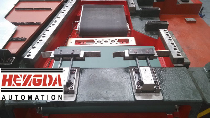 一種開卷落料模具的板料輸送機(jī)構(gòu),包括:推力擺臂、軸銷、推力擺臂座和氣缸滑動組件;所述氣缸滑動組件水平設(shè)置,推力擺臂座固定在氣缸滑動組件的可動部分上;所述推力擺臂通過水平設(shè)置的所述軸銷,可轉(zhuǎn)動的設(shè)置在推力擺臂座上,且軸銷的軸線與氣缸滑動組件的運(yùn)動方向垂直。采用了本實(shí)用新型技術(shù)方案的開卷落料模具的板料輸送機(jī)構(gòu),由于采用氣缸滑動組件驅(qū)動,相比現(xiàn)有技術(shù)中采用電機(jī)驅(qū)動或者電磁驅(qū)動的板料輸送機(jī)構(gòu),具有結(jié)構(gòu)簡單、制造工藝簡單的優(yōu)點(diǎn),因而能節(jié)省投資;此外還具有使用簡便、工作可靠、使用壽命長、維護(hù)成本低等優(yōu)點(diǎn),因而便于推廣,實(shí)用性和通用性均較強(qiáng)。
